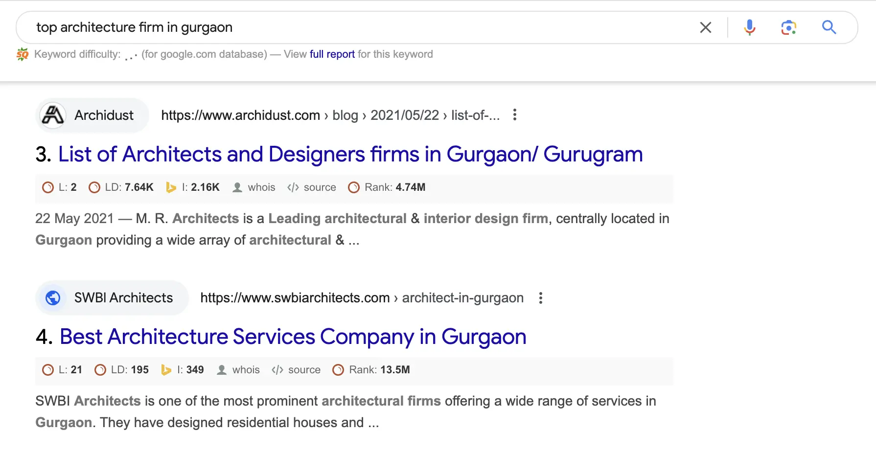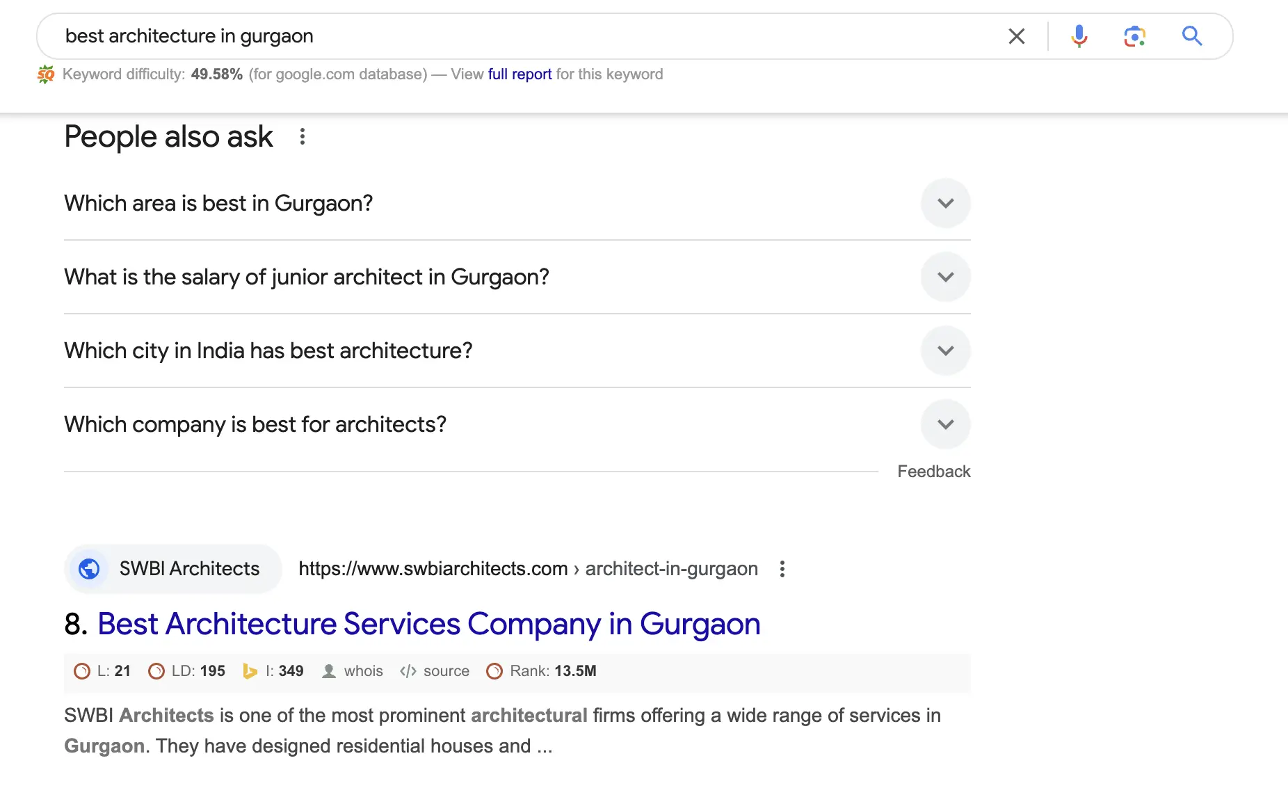 In May 2021 through to April 2022, we collaborated with SWBI Architects to enhance their online presence and improve their visibility in competitive architecture markets in Bangalore, Chennai, Gurgaon, Hyderabad and in Pune.